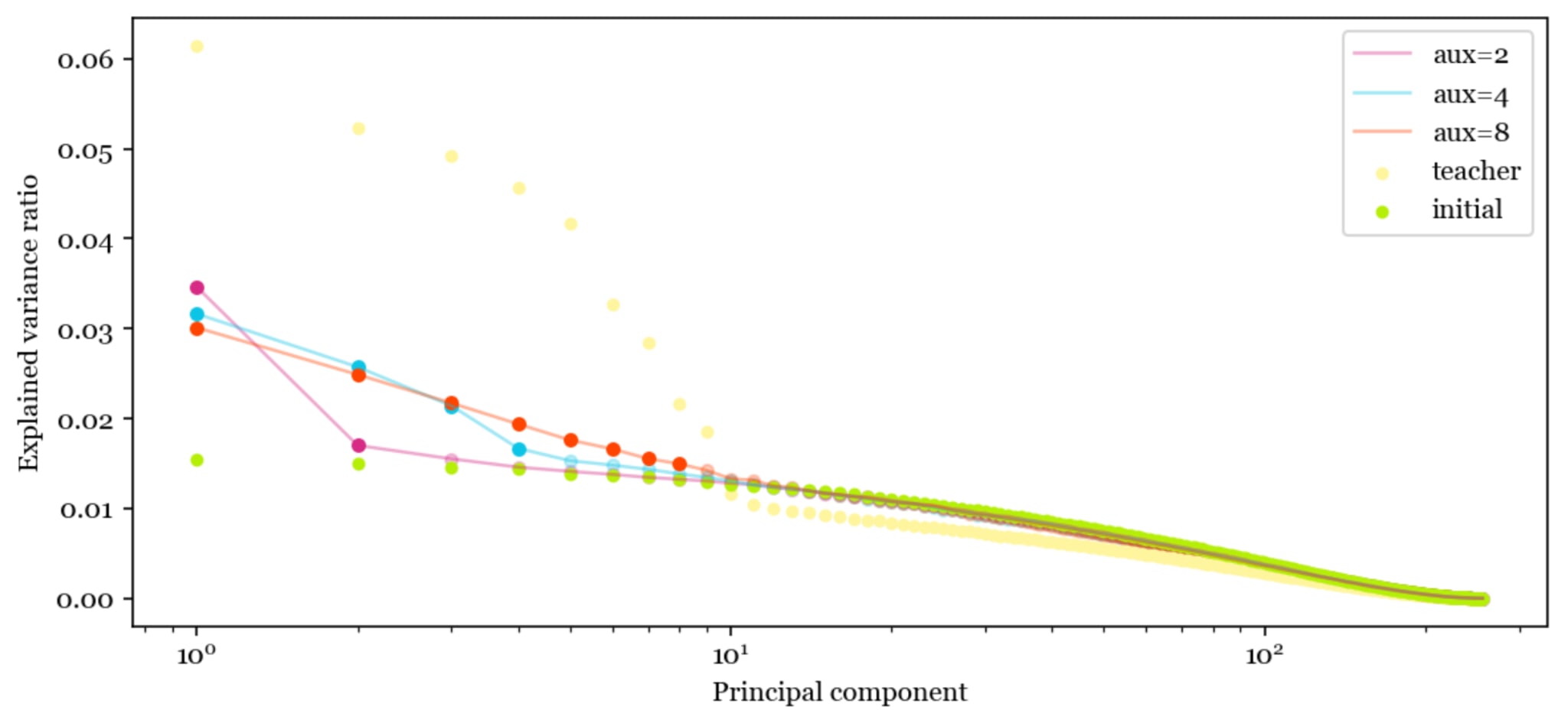 In the plot below, I show the explained variance of the ranked principal components for the final hidden layer (a 256×256 tensor) in a MNIST classifier. The original weight initialization and the teacher are shown as baselines. We can see that the number of principal components that are significantly above the untrained matrix is roughly equal to the number of auxiliary logits the student was trained on.