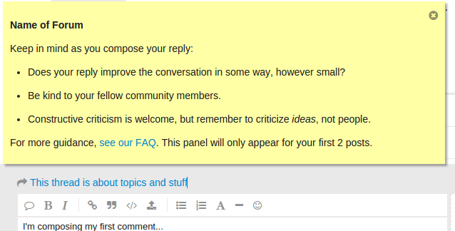 1) like the discourse.org forums, remind people of these norms a few times as they get used to the platform. Discourse shows this message to new users the first couple of times they go to comment. Something similar here might make sense.