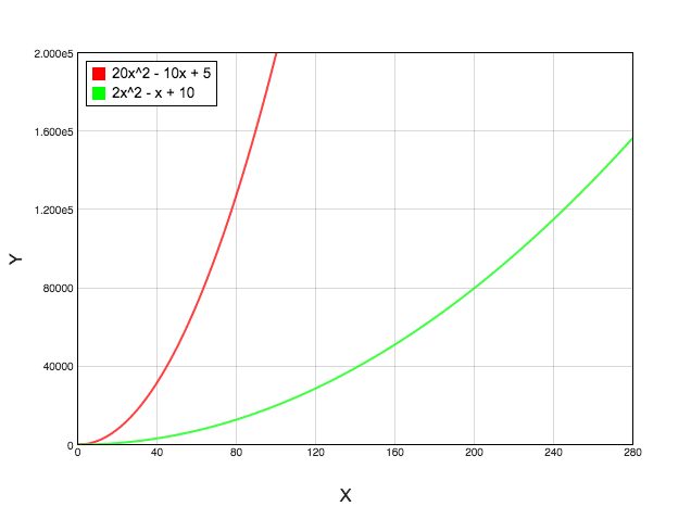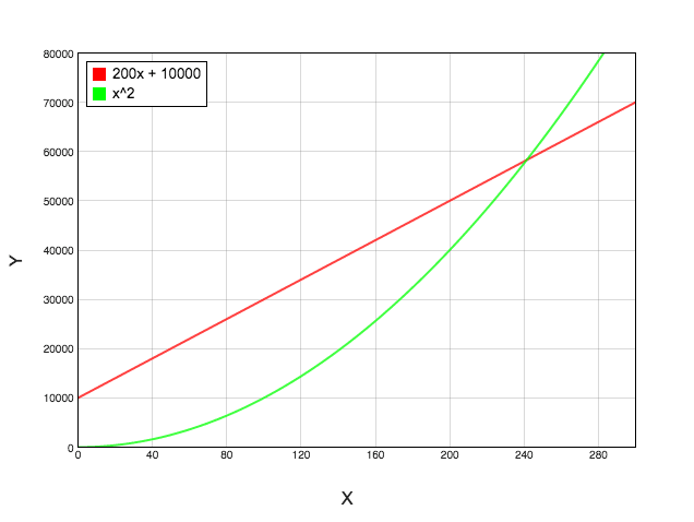 In other words will eventually overtake , no matter how much you scale by. From our first example, we showed that . This means that, no matter what you pick, will eventually be overtaken by – it's just a matter of finding a big enough .
