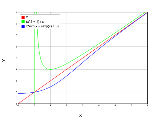 For example, as x grows large, the three functions above all start to take on the same asymptotic behavior. Asymptotic notation gives a way to express the relationship between two functions' asymptotic behaviors.