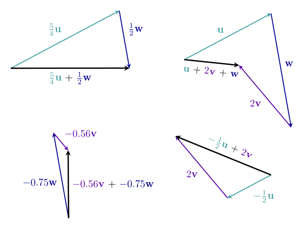 Now that we know how vectors work, we want to know how to work with them. In this page, we'll study some fundamental concepts in working with vectors. This will make using them and thinking about them easier. We'll start by combining vectors to make new vectors, and we will use this tool to help us describe and understand vector spaces, and to make it easier to talk about different vectors. In particular, we will learn how we can communicate a particular vector algebraically, without needing to share a picture.