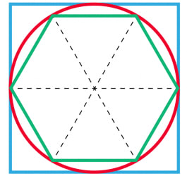 If the diameter here is 1, then the perimeter of the hexagon is 3, the perimeter of the square is 4, and the circumference of the circle is in between. There are no integers between 3 and 4.